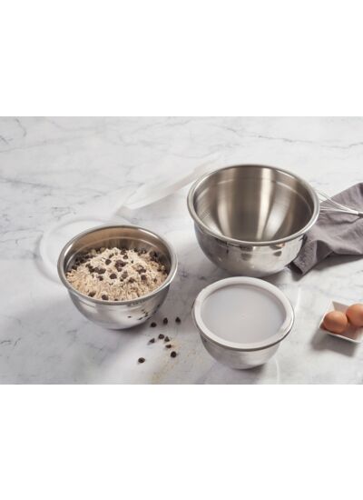 Idéal pour le mélange, la préparation et le stockage des aliments, le jeu de 3 bols en acier inoxydable avec couvercles est essentiel dans n’importe quelle cuisine. Les trois tailles (19 cm, 23 cm, 27 cm) s’empilent parfaitement pour un rangement compact, avec des bases et des couvercles antidérapants qui aident à conserver les aliments plus longtemps. Adaptés au congélateur, les bols sont également lavables au lave-vaisselle pour un nettoyage facile.
