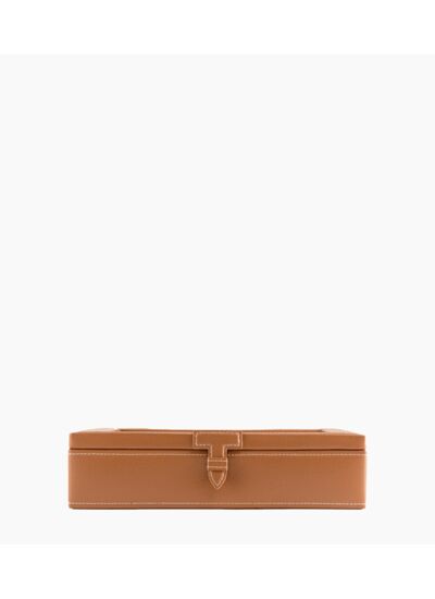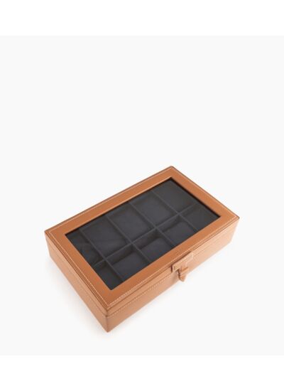 Coffret huit montres vitré avec doublure velours, marquage Le Tanneur ton sur ton et fermoir en T signature.Cuir recyclé de vachette. Intérieur velours crépuscule.Largeur : 25 cm x Hauteur : 19 cm x Profondeur : 7 cm