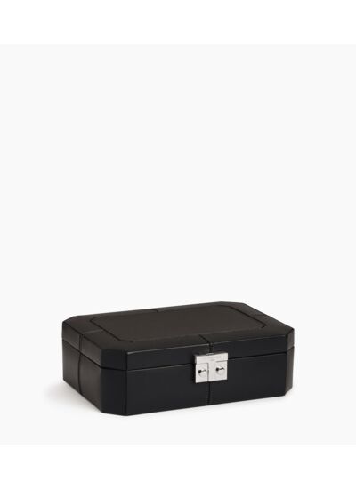 Le coffret peut accueillir jusqu’à six montres ainsi que des boutons de manchettes, offrant un espace optimisé grâce à son design octogonal et ses dimensions précises de 27 cm de largeur, 8 cm de hauteur et 19,5 cm de profondeur.