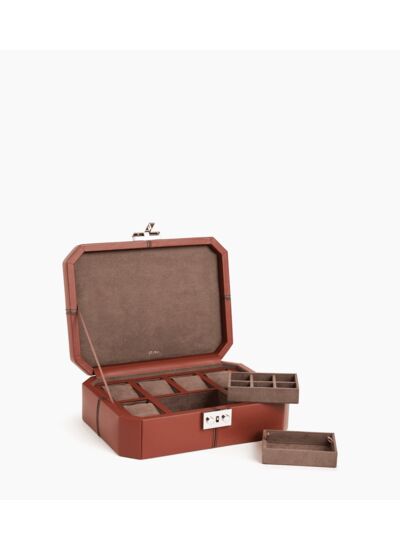 Le coffret peut accueillir jusqu’à six montres ainsi que des boutons de manchettes, offrant un espace optimisé grâce à son design octogonal et ses dimensions précises de 27 cm de largeur, 8 cm de hauteur et 19,5 cm de profondeur.