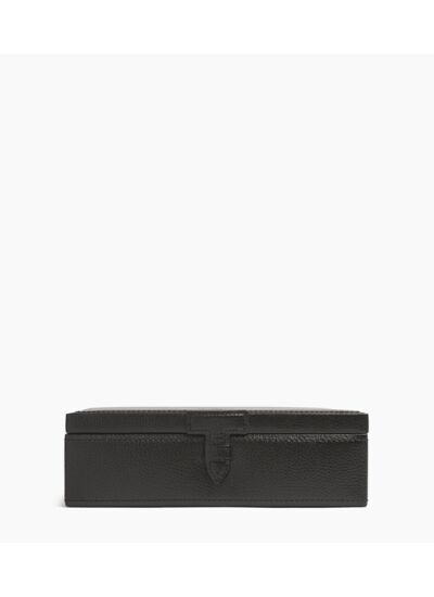 Le coffret est fabriqué en refente de cuir de vachette, reconnu pour sa robustesse et son aspect élégant, avec un piquage soigné et un fermoir en T emblématique de la Maison Le Tanneur.