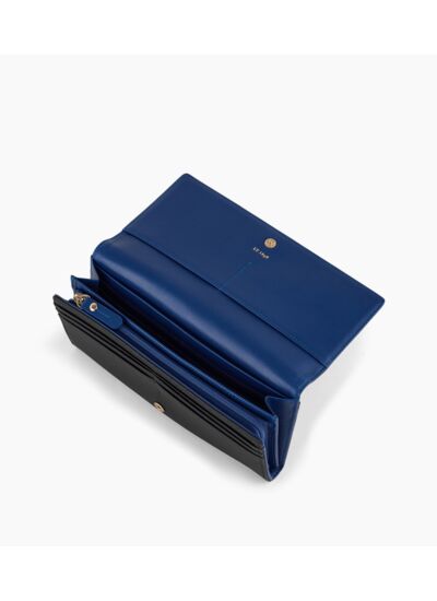 Compagnon à rabat avec marquage Le Tanneur sur film doré clair. Sécurité anti-RFID.Cuir de vachette grain T. Doublure textile Le Bleu.3 poches plates, 1 soufflet, 1 poche zippée monnaie et 10 compartiments cartes, 1 poche arrière.Accessoires métalliques finition doré clair.Largeur : 19 cm x Hauteur : 11 cm