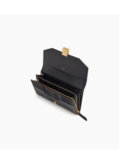 Grand portefeuille avec fermoir signature finition doré brossé et poche monnaie zippée. Dispose d'une protection RFID.Cuir de vachette pleine fleur lisse. Doublure textile jacquard noir.8 compartiments cartes et 1 poche zippée monnaie. 1 soufflet, 6 compartiments cartes et 2 poches plates. 1 poche plate arrière.Accessoires métalliques finition doré brossé.Largeur : 19 cm x Hauteur : 11 cm x Profondeur : 2 cm