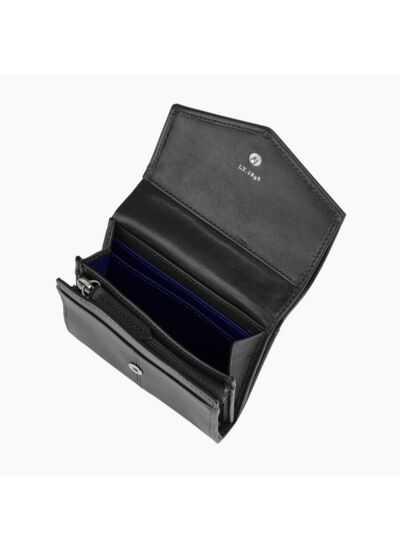 En plus de ses lignes saillantes, son cuir lisse et son intérieur à la fois graphique et moderne. Ce portefeuille comporte une doublure Le Bleu signature de la Maison.Cuir de vachette pleine fleur lisse. Doublure textile.2 poches plates, 1 soufflet, 1 poche zippée monnaie, 1 poche billets et 3 compartiments cartes, 1 poche plate arrière.Accessoires métalliques finition argent.Largeur : 11 cm x Hauteur : 9.5 cm
