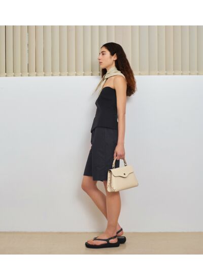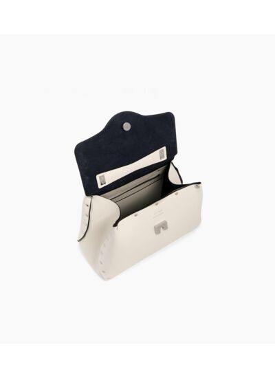 Petit sac à main fabriqué en France et monté sur rivets, spécialité de la Maison. Doublure en refente de cuir. Porté main, croisé ou épaule grâce à sa bandoulière en cuir ajustable et amovible.Cuir de vachette pleine fleur grain chèvre. Doublure en refente de cuir de vachette crépuscule.2 poches plates 1 poche zippée. Poignée. Bandoulière ajustable et amovible.Accessoires métalliques finition argent.Largeur : 24 cm x Hauteur : 16 cm x Profondeur : 10 cm
