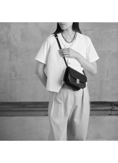 Petit sac bandoulière avec fermoir signature et intérieur jacquard anniversaire 125 ans. Porté main, épaule ou croisé grâce à sa bandoulière ajustable et amovible.Cuir de vachette pleine fleur lisse. Doublure textile jacquard noir.1 poche plate et 1 poche zippée. 1 poche aimantée arrière. Bandoulière ajustable et amovible.Accessoires métalliques finition doré brossé.Largeur : 19 cm x Hauteur : 14 cm x Profondeur : 6 cm