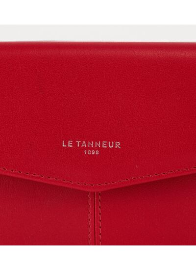 Pochette enveloppe avec fermeture pression et marquage Le Tanneur sur film argent.Cuir de vachette pleine fleur lisse. Doublure textile.2 poches plates. 1 poche plate arrière.Accessoires métalliques finition argent.Largeur : 15 cm x Hauteur : 10 cm