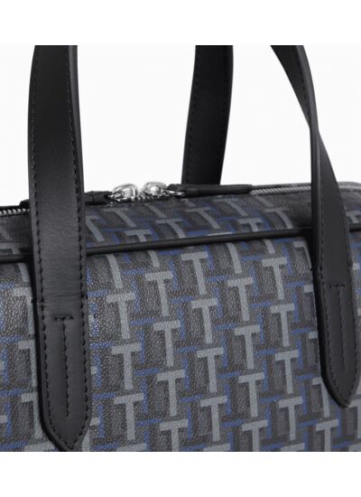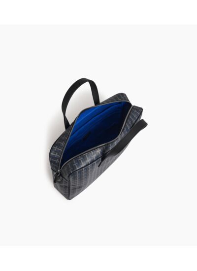 Porte-documents bi-matière en cuir et toile enduite imprimé signature. Porté main, croisé ou épaule grâce à sa bandoulière ajustable et amovible.Toile coton enduite garnie cuir de vachette pleine fleur végétal. Doublure textile le Bleu.2 poches plates et 1 poche zippée. Bandoulière amovible et ajustable.Accessoires métalliques finition argent.Largeur : 35 cm x Hauteur : 27.5 cm x Profondeur : 8 cm