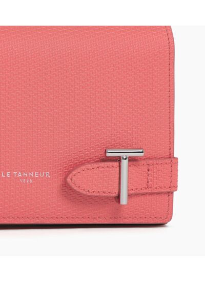 Portefeuille avec double T signature, fermeture pression et poche monnaie zippée. Dispose d'une protection RFID.Cuir de vachette grain t pleine fleur. Doublure textile Le Bleu.4 poches plates, 10 compartiments cartes, 1 poche zippée 2 soufflets. 1 poche plate arrière.Accessoires métalliques finition argent.Largeur : 14 cm x Hauteur : 10 cm x Profondeur : 1 cm