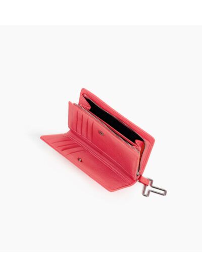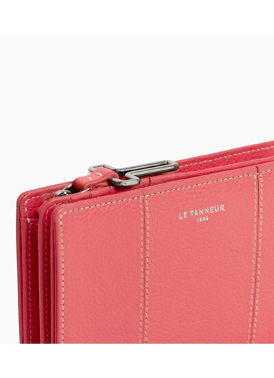 Portefeuille moyen format avec fermeture pression, marquage Le Tanneur et poche monnaie zip T signature.Cuir de vachette pleine fleur grainé. Doublure textile jacquard T crépuscule.1 poche monnaie zippée, 2 soufflet. 1 poche billets, 10 compartiments cartes et 3 poches plates.Accessoires métalliques finition argent.Largeur : 9.5 cm x Hauteur : 14 cm x Profondeur : 1 cm