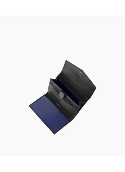 Il dispose de 12 compartiments pour cartes, une poche zippée pour la monnaie, une poche chéquier, deux poches plates, un soufflet, un passant stylo et une poche plate arrière, permettant une organisation parfaite.