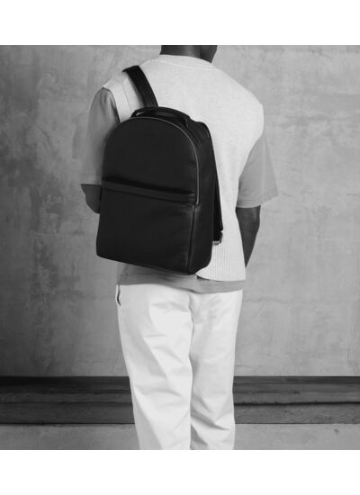 Sac à dos zippé en toile polyamide avec renfort cuir marqué ton sur ton. Bretelles ajustables. Peut contenir un ordinateur 13".Toile enduite et cuir de vachette lisse. Doublure textile.1 poche moussée ordinateur. 1 poche zippée avant. Bretelles ajustables.Accessoires métalliques finition argent.Largeur : 31 cm x Hauteur : 40 cm x Profondeur : 13 cm