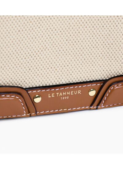 Besace moyen modèle en toile naturelle et cuir lisse, avec fermeture aimantée et intérieur jacquard anniversaire 125 ans. Éléments métalliques finition doré clair et marquage Le Tanneur embossé ton sur ton. Porté main, croisé ou épaule grâce à sa bandoulière ajustable et sa poignée amovible ajustée au corps du sac.Cuir de vachette lisse pleine fleur et toile naturelle 100% coton. Doublure textile jacquard anniversaire noir.1 poche plate, 1 poche zippée et 1 poche plate. Mousqueton clés. 1 poche plate arrière. Poignée amovible. Bandoulière ajustable et amovible.Accessoires métalliques finition doré clair.Largeur : 22 cm x Hauteur : 18 cm x Profondeur : 8 cm