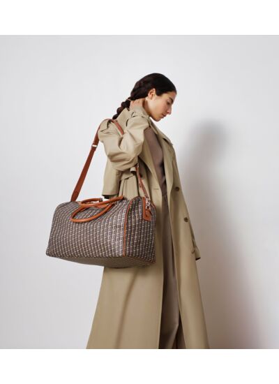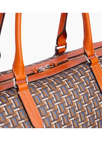Sac de voyage en toile de coton enduite signature T et poignées piquées elles aussi en T. Porté main, croisé ou à l’épaule avec sa bandoulière amovible et ajustable.Toile monogramme et cuir de vachette pleine fleur lisse. Doublure textile.1 poche plate et 1 poche zippée. Bandoulière ajustable et amovilble.Accessoires métalliques finition argent.Largeur : 50 cm x Hauteur : 29 cm x Profondeur : 22 cm