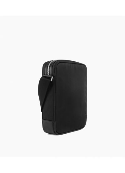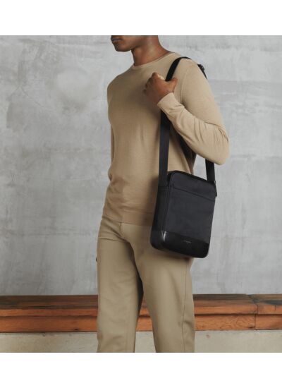 Sacoche moyen modèle en toile polyamide avec renfort cuir marqué ton sur ton. Ce moyen modèle se porte à l’épaule ou croisé. Bandoulière ajustable.Toile enduite et cuir de vachette lisse. Doublure textile.1 poche moussée, 1 passant stylo et 1 poche téléphone. 1 poche zippée avant. Bandoulière ajustable.Accessoire métallique finition argent.Largeur : 24 cm x Hauteur : 28 cm x Profondeur : 6 cm