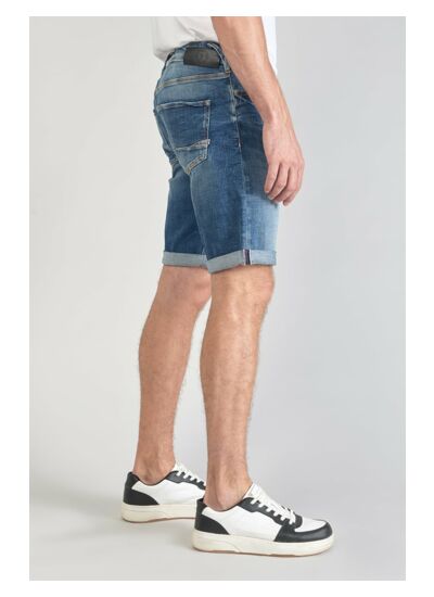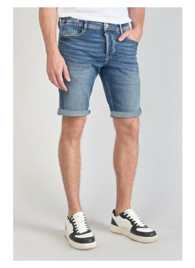 Toile stretch en jeans uni, coupe short à hauteur de taille standard, fermeture boutonnée. Marque : Le temps des cerises.