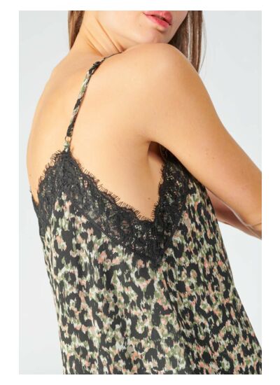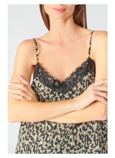 Col V, coupe droite, fines bretelles, tissu fluide et motif animalier. Marque : Le temps des cerises.