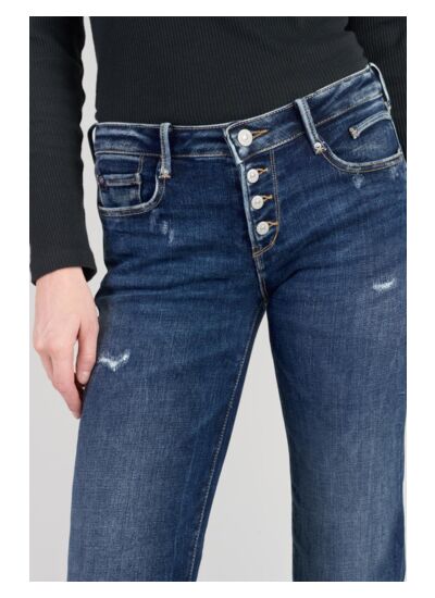 Toile très stretch, coupe bootcut avec jambe évasée, hauteur de taille standard, fermeture à boutons, jacron en cuir, abrasions et trous réparés pour un look vintage travaillé.