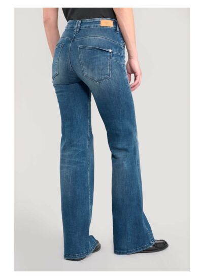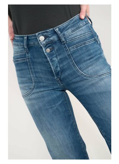 Toile stretch italienne Candiani, coupe bootcut, taille haute, effet pulp repulpant, jambe évasée, fermeture à double boutons visibles, poche arrière retournée.