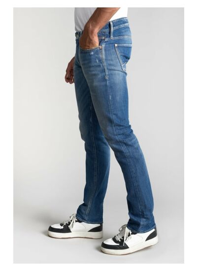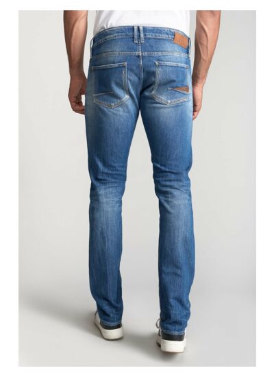 Toile stretch, coupe droite, hauteur de taille standard, forme hanche resserrée, cuisses et genoux droits, chevilles droites. Fermeture zippée YKK personnalisée LTC. Détails d’abrasions et applications effet clous cuivrés sur les poches.