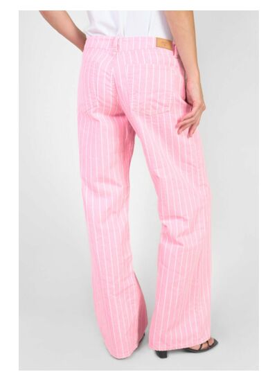 Coupe flare, hauteur de taille standard, jambes évasées, fermeture à boutons. Longueur 34. Coloris rose rayé. Marque : Le temps des cerises.