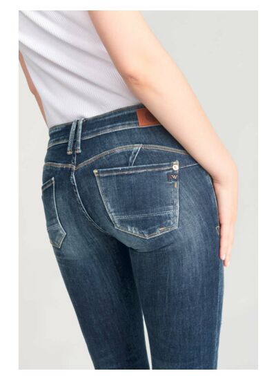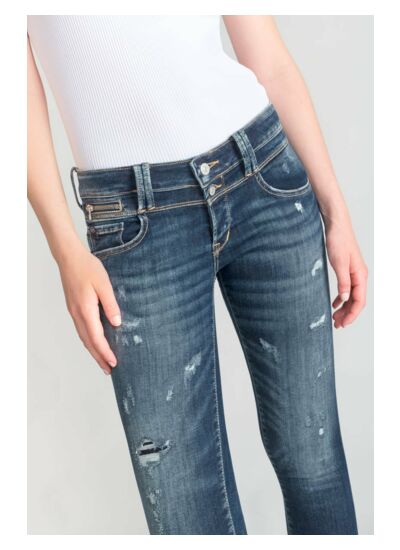 Ce jeans fait partie de la gamme Héritage, la plus travaillée de la marque Le temps des cerises. Il présente une coupe slim avec une hauteur de taille standard, une fermeture à boutons, des abrasions et des trous réparés pour un look authentique. Sa toile italienne Candiani très stretch garantit durabilité et confort.