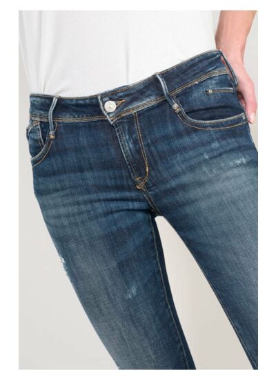 Ce jeans fait partie de la gamme Héritage, la plus travaillée de la marque Le Temps des Cerises. Il présente une coupe slim, une hauteur de taille standard, une fermeture zippée YKK personnalisée LTC, une toile stretch et des abrasions soigneusement placées pour un look authentique.