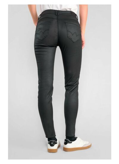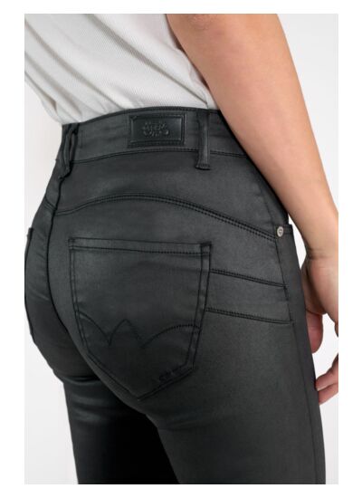Toile stretch à aspect enduit, coupe slim, taille haute, effet push-up, jambe étroite, fermeture zippée YKK personnalisée LTC, jacron en cuir, surpiqûres signature, bouton bijou avec pierre noire. Longueur 7/8ème.