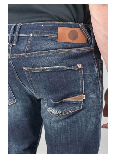 Toile peu stretch, coupe slim, taille standard, hanche resserrée, cuisses et genoux droits, chevilles resserrées, fermeture à boutons, poches arrière retournées, abrasions, trous réparés, bords de poches usés. Ce modèle appartient à la gamme Héritage et à la gamme Eco Friendly de Le temps des cerises.