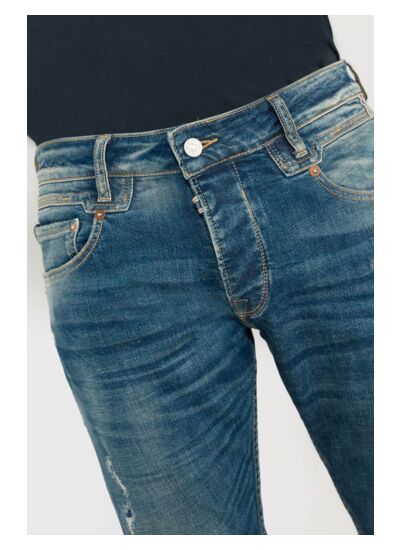 Jeans slim stretch 700/11, longueur 34, marque Le temps des cerises. Toile stretch de haute qualité. Coupe slim avec forme resserrée aux hanches, cuisses, genoux et chevilles. Hauteur de taille standard. Fermeture à boutons. Détails d’usure authentiques : abrasions et trous réparés. Intégré à la gamme Héritage, la plus travaillée de la marque.