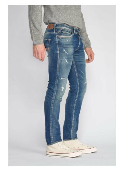 Toile stretch, coupe slim, hauteur de taille standard, forme resserrée aux hanches, cuisses, genoux et chevilles. Fermeture à boutons, jacron en cuir, abrasions, trous réparés, poche arrière retournée, bords de poches usés. Longueur 34. Produit issu de la gamme Héritage et Eco Friendly.