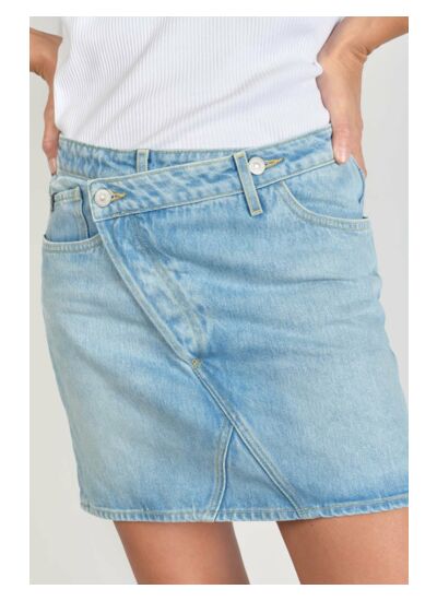 Jupe droite courte en jeans uni, coupe droite, hauteur de taille standard, fermeture boutonnée. Tissu : jeans. Marque : Le temps des cerises.