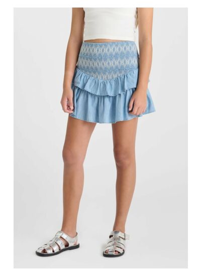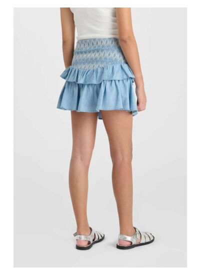 Jupe courte en jeans uni, coupe évasée patineuse, taille haute. Marque : Le temps des cerises.