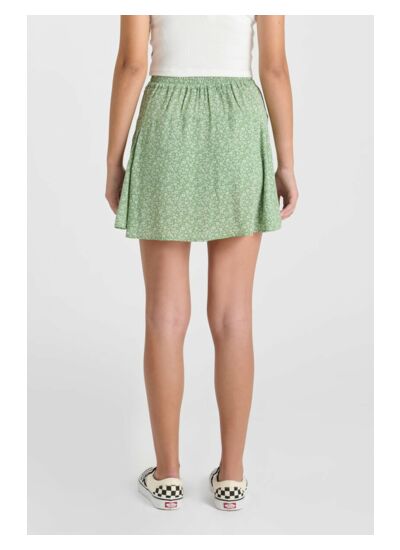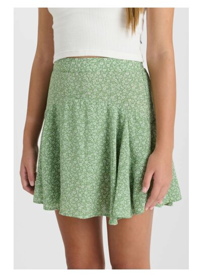 Jupe courte à taille haute, coupe évasée patineuse, tissu fluide, motif floral. Marque : Le temps des cerises.