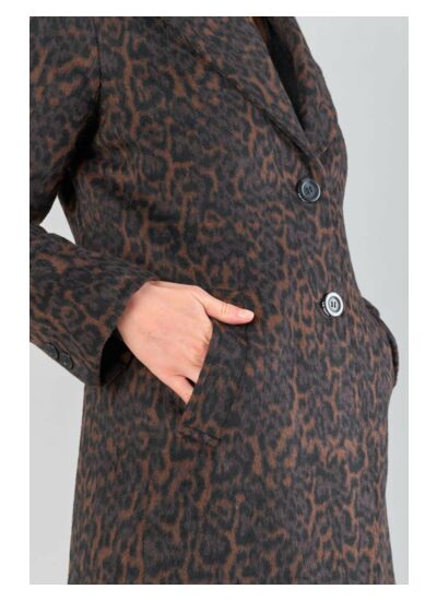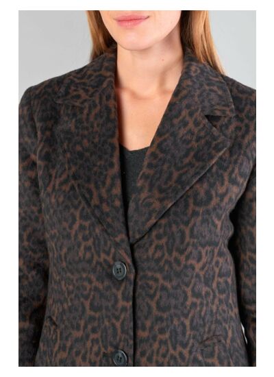 Col tailleur, coupe cintrée, fermeture boutonnée, manches longues et doublure intégrale définissent ce manteau détente à motif animalier signé Le temps des cerises.