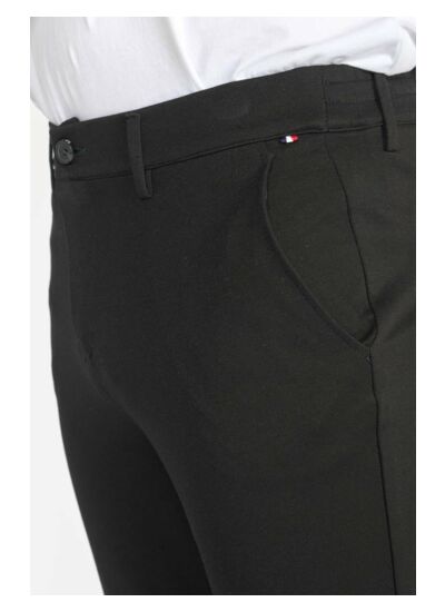 Réponse. Le pantalon présente une coupe carotte, ajustée au niveau des jambes pour un style moderne.