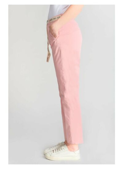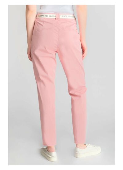 Coupe chino ajustée, taille haute, fermeture zippée. Poches avant italiennes, poches arrière passepoil. Tissu en chino uni, style casual. Marque : Le temps des cerises.