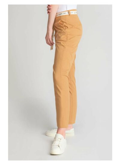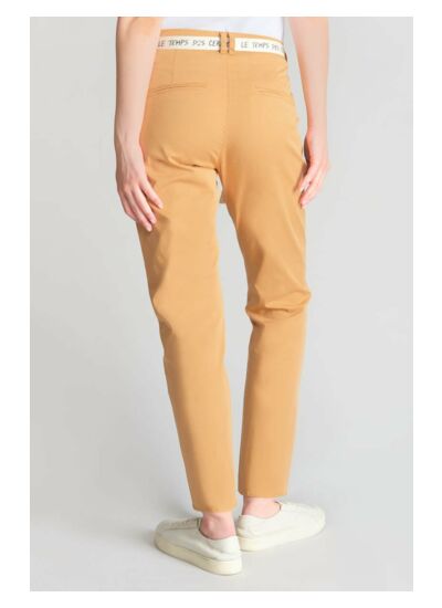 Coupe chino ajustée, taille haute, fermeture zippée. Poches avant italiennes, poches arrière passepoil. Tissu en chino uni, style casual. Marque : Le temps des cerises.