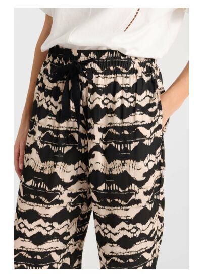 Coupe droite, taille haute, fermeture par cordon, poches avant invisibles, tissu fluide à motif ethnique, style casual. Marque : Le temps des cerises.