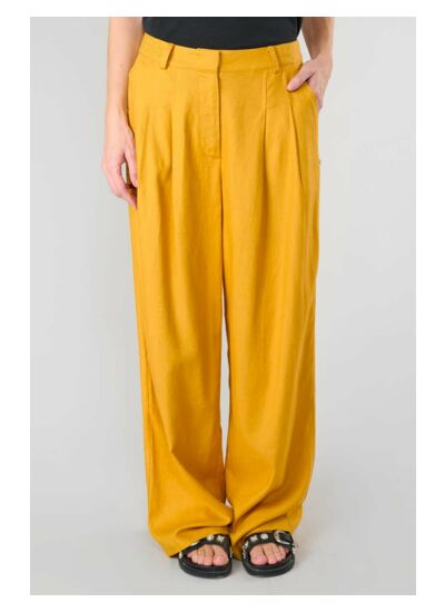 Coupe droite, taille haute, fermeture zippée, poches italiennes. Tissu fluide uni. Style city. Marque Le temps des cerises.