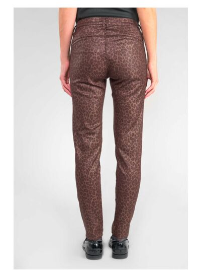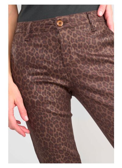 Coupe slim, taille haute, fermeture zippée. Poches avant italiennes, poches arrière passepoil. Tissu agréable au toucher. Motif animalier brillant. Style city. Marque Le temps des cerises.