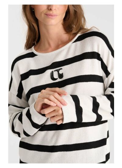 Le pull MACY est doté d’un col rond, d’une coupe droite, de manches longues, d’une épaisseur en fine maille et arbore un motif rayé. Il incarne le style casual signé Le temps des cerises.