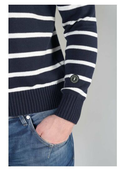 Col rond, coupe droite, manches longues, poignets en bords côtes, fine maille légère, motif rayures, style casual. Marque : Le temps des cerises.