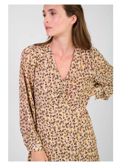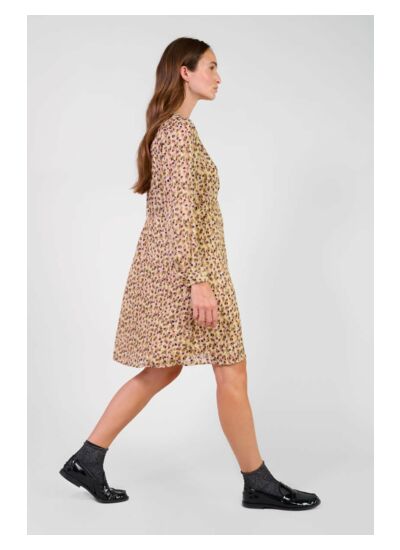 Col V, longueur genoux, manches longues avec poignets boutonnés, robe doublée en tissu fluide à motif graphique. Coupe droite, style soirée et habillé. Produit issu de la gamme Eco Friendly de la marque Le temps des cerises.