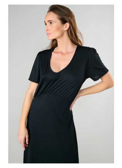 Col V, manches courtes, coupe droite longue, tissu fluide en modal, motif uni. Style casual. Marque : Le temps des cerises.