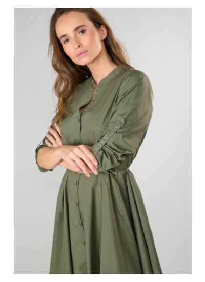 Cette robe CATLEYA de la marque Le temps des cerises présente un col polo chemise, une coupe évasée patineuse, des manches trois-quarts avec patte de retroussage, un tissu agréable et un motif uni, parfait pour un style urbain affirmé.