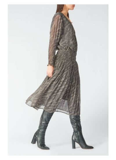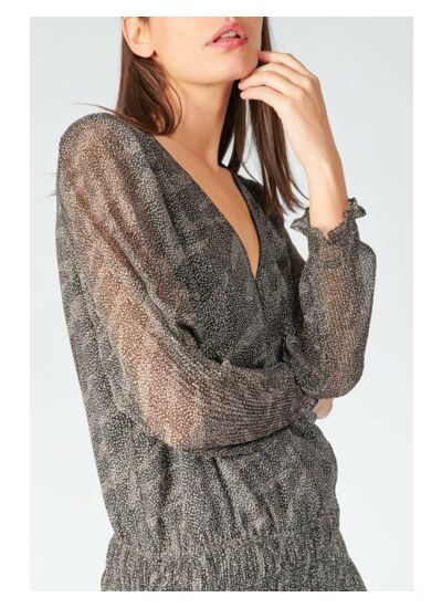 Col V, longueur longue, coupe droite, manches longues avec poignets élastiqués. Tissu léger doublé pour un tombé impeccable. Motif animalier discret, style soirée habillé. Marque Le temps des cerises.