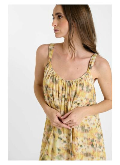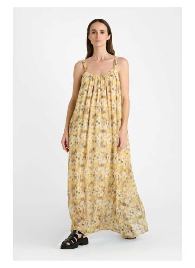Col rond, longue, coupe droite, fines bretelles, doublée, tissu fluide, motif imprimé, style city. Marque : Le temps des cerises.