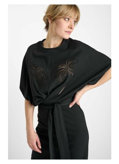 Col rond, longueur midi 3/4, manches courtes, tissu agréable au toucher, motif brodé, coupe droite. Style city. Marque : Le temps des cerises.