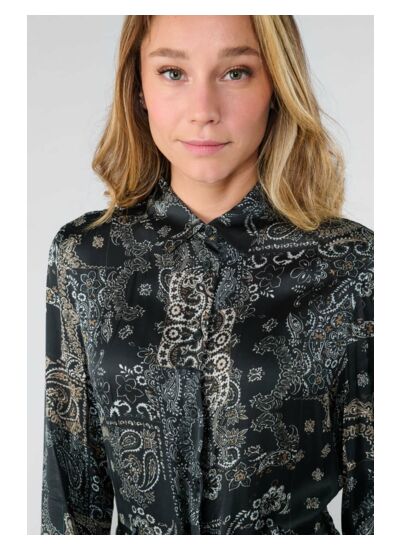 Col polo chemise, longueur midi 3/4, coupe droite, manches longues avec poignets boutonnés, tissu fluide à motif cachemire. Style city, marque Le temps des cerises.